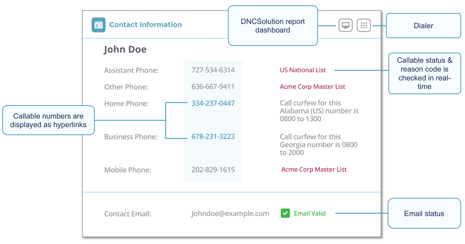Every phone & email tied to a lead, contact, or account is automatically validated for:- Federal, State, and Internal DNC lists