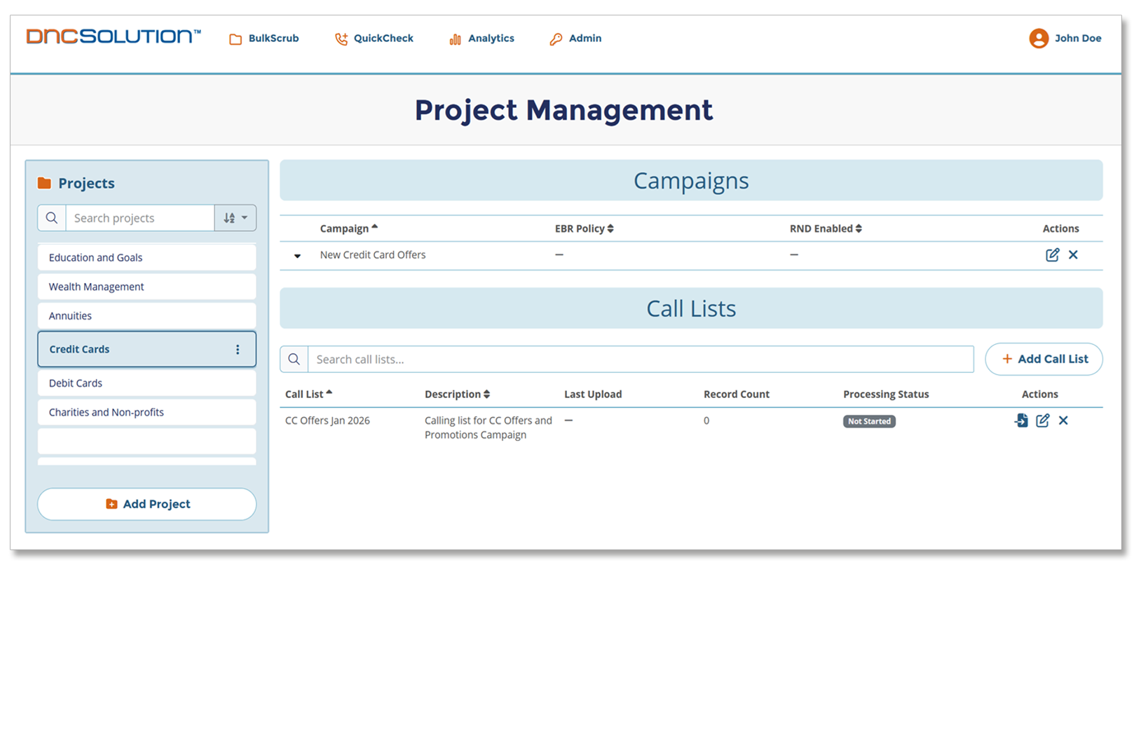 Organize compliance workflows using Projects, Campaigns, and Call Lists, providing clearer structure and more precise control over individual scrub jobs. - Effectively manage company-specific Do Not Call lists